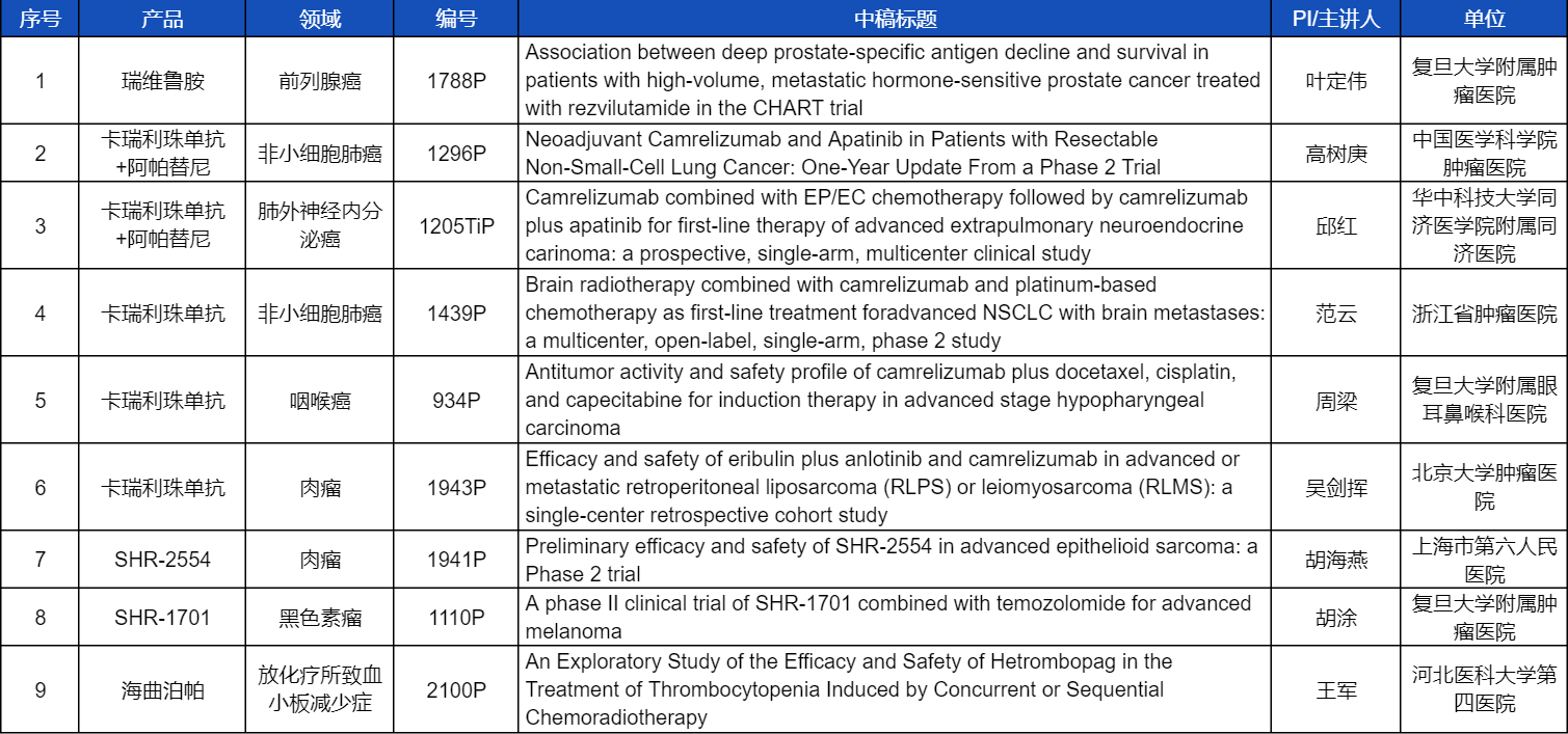在非小细胞肺癌、咽喉癌、肉瘤、前列腺癌、黑色素瘤等多个领域,卡瑞利珠单抗、阿帕替尼、瑞维鲁胺、SHR-1701、SHR2554等创新产品相关研究一共入选了8项壁报展示。此外,尊龙凯时国际医药自主研发的血小板生成素受体激动剂(TPO-RA)海曲泊帕在放化疗所致血小板减少领域的探索性研究显示良好的疗效,入选壁报展示。